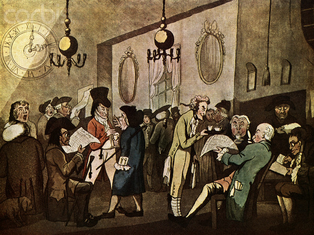 1798 — An illustration of Edward Lloyd’s coffee house, which served as a headquarters for marine underwriters. The business eventually evolved into Lloyd’s of London insurance company. — Image by © Bettmann/CORBIS